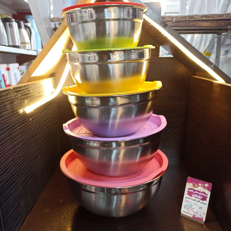 ظرف پنج تیکه استیل دوجداره درب رنگی با پنج سایز متفاوت و کاربردی برای مسافرت و داخل منزل و استفاده روزمره